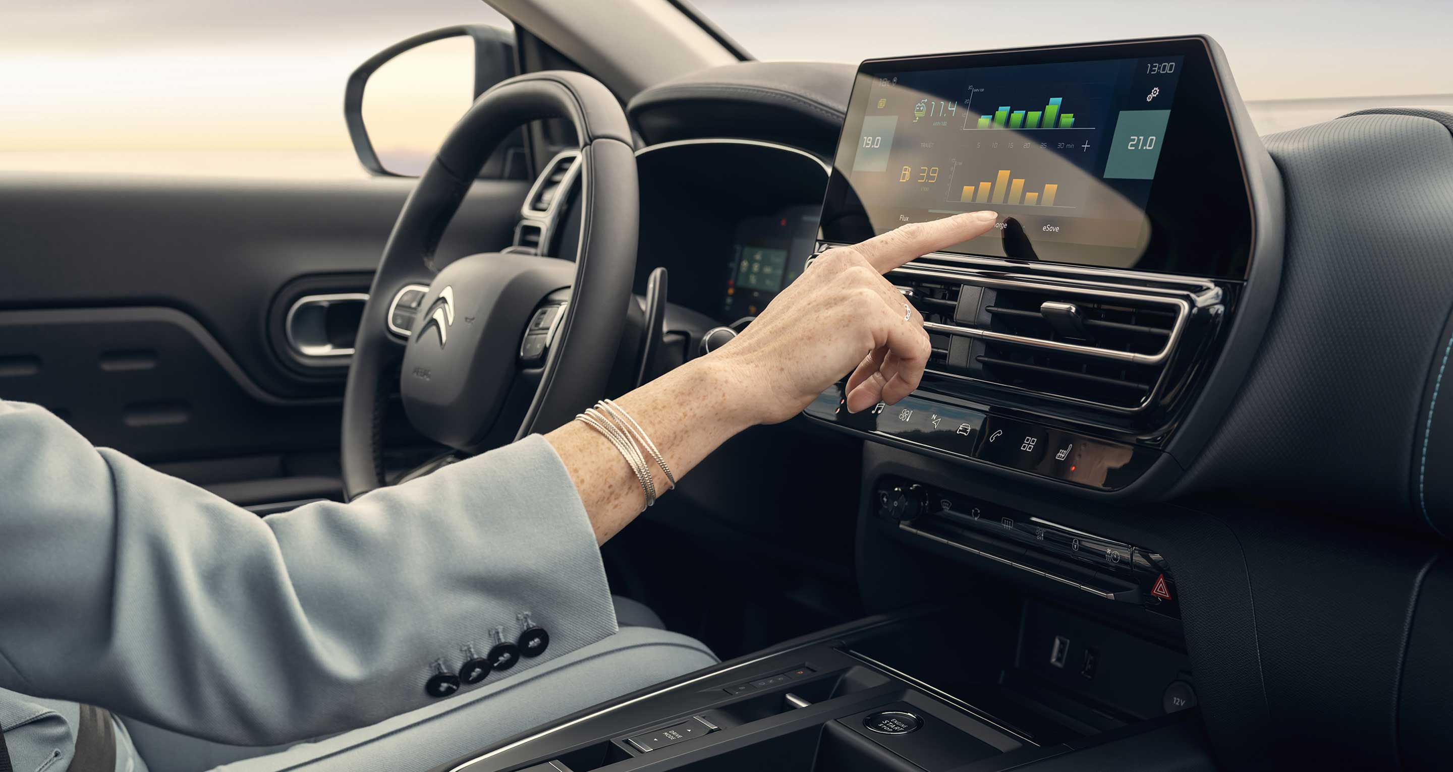Uus 10" ekraan muudab uue Citroën C5 Aircrossi veelgi kasutajasõbralikumaks, pakkudes otsest ligipääsu kliimaseadme juhtnuppudele, ja kõrgem paigutus võimaldab sul pilku teel hoida. Ventilatsiooniavad paiknevad nüüd ekraani all ja neile annab modernsema ilme uus teravam ja horisontaalsem kujundus.